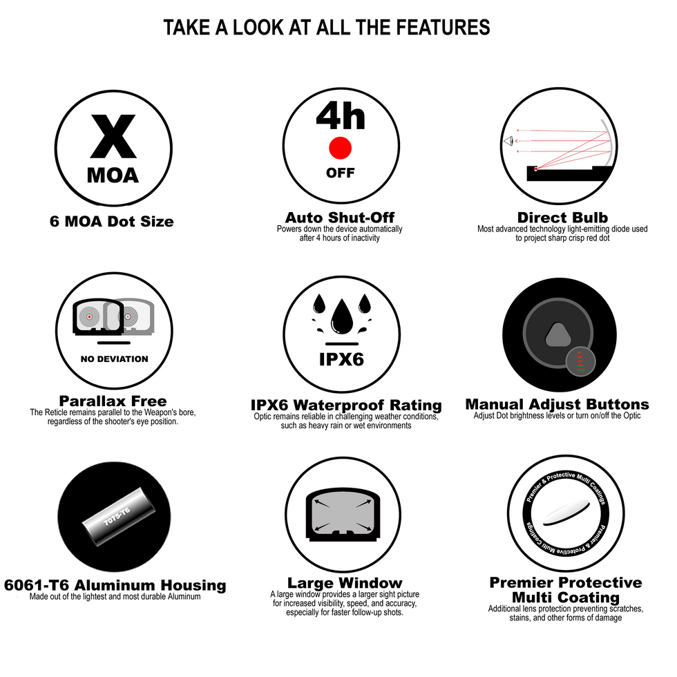 Crafted from lightweight and durable 6061 T6 aluminum alloy, the SCRD-40 boasts an anodized matte black finish for enhanced resistance to wear and harsh conditions. Its ultra-slim design and net weight of just 56g (2.0oz) make it a perfect choice for shooters seeking minimal bulk without sacrificing performance. The sight features 8 brightness settings, including 2 night vision-compatible levels, and manual brightness adjustment with conveniently placed side controls for effortless operation.