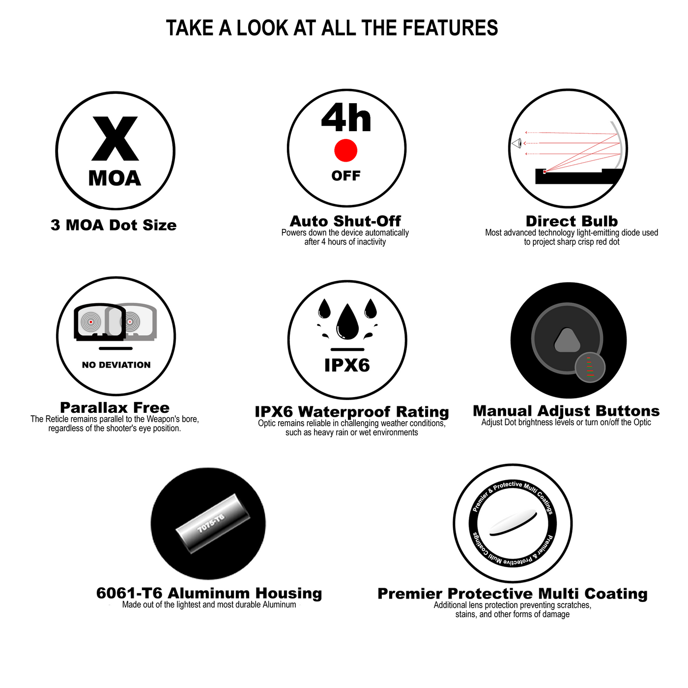 This cutting-edge optic features a crisp 3 MOA dot reticle, providing precision aiming with 8 adjustable brightness levels and 2 night vision settings, ensuring clarity in any lighting condition. Its fully multi-coated lens delivers a clear, distortion-free sight picture with parallax-free operation, enabling faster target acquisition.