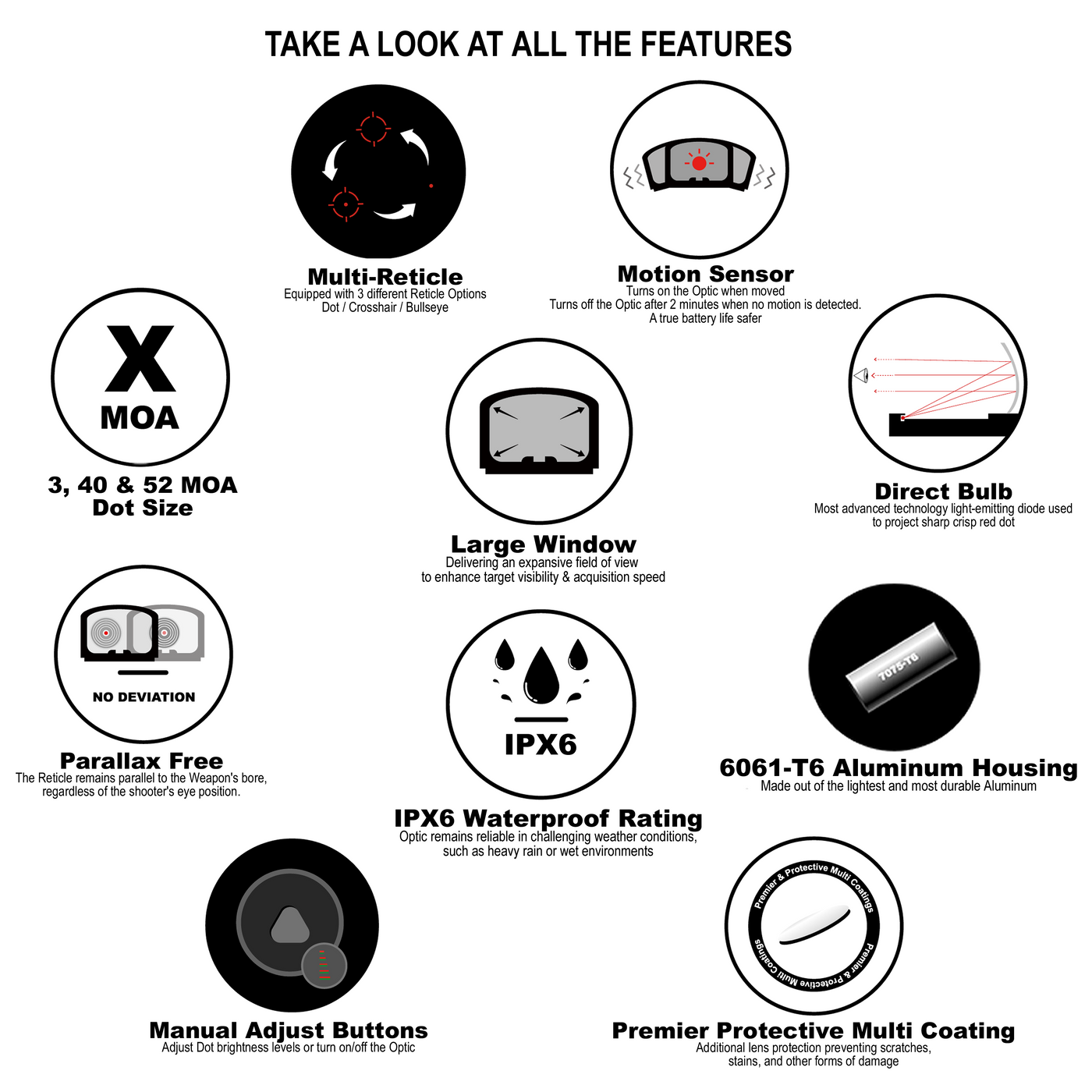 Constructed from rugged 6061 T6 aluminum alloy with a sleek matte black finish, this ultra-slim red dot weighs just 30g and has a profile of only 7mm, balancing durability and lightweight performance. Advanced features like Shake Awake motion activation, a 2-minute auto shut-off, and a 50,000-hour battery life on the lowest setting make it reliable and energy-efficient. Powered by a CR2032 battery, the sight offers 8 brightness levels, 2 night vision settings, a parallax-free design, and unlimited eye relief for consistent accuracy in all lighting conditions.