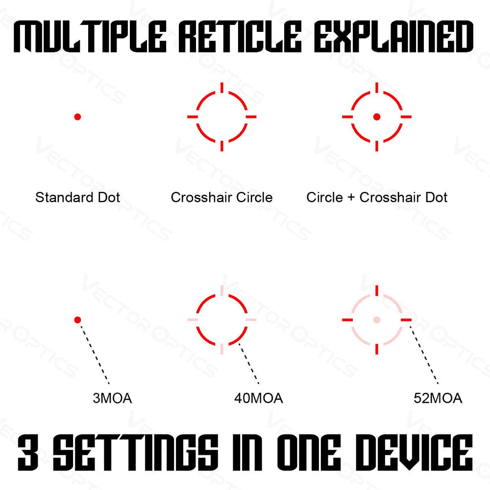 The Vector Optics Frenzy Red Dot Sight SCRD-M36 is a premium multi-reticle optic engineered for precision, durability, and versatility across tactical, hunting, and competitive shooting applications. Its large 26x22 mm lens delivers a wide field of view for rapid target acquisition and superior situational awareness. The multi-reticle system offers a customizable aiming experience, with options including a 3 MOA dot, 40 MOA circle, and 52 MOA crosshair, ensuring adaptability to various environments and shooting preferences.
