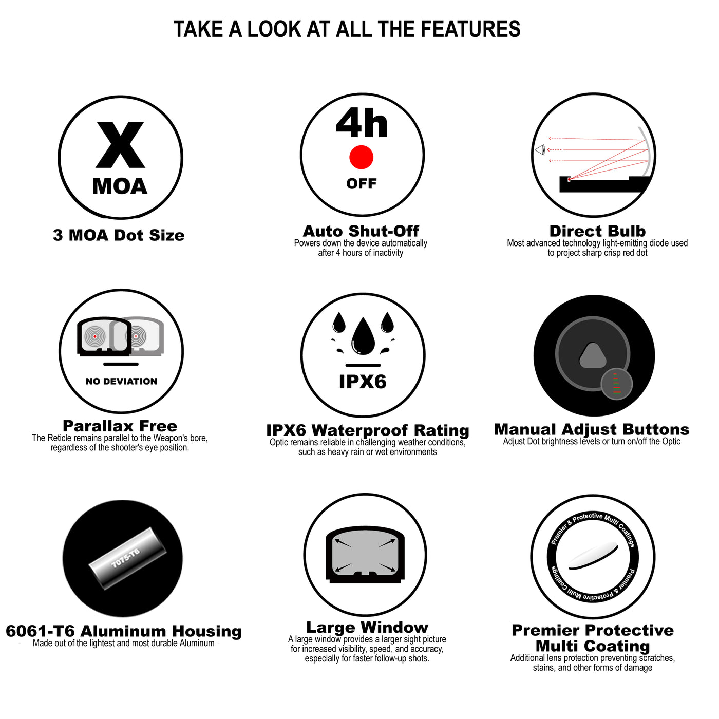For convenience and efficiency, this optic includes an auto shut-off function after four hours of inactivity to preserve the 50,000-hour battery runtime provided by its CR2032 power source. The parallax-free design, optimized at 100 yards, ensures consistent accuracy, while the waterproof IP67 rating protects against dust, debris, and immersion. A premier protective lens coating further enhances clarity and shields against scratches, keeping your optic in peak condition.